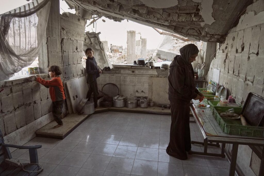 Amani Halawa prépare à manger dans sa maison partiellement détruite par les bombardements, à Jabaliya, dans la bande de Gaza, le 25 novembre 2025.