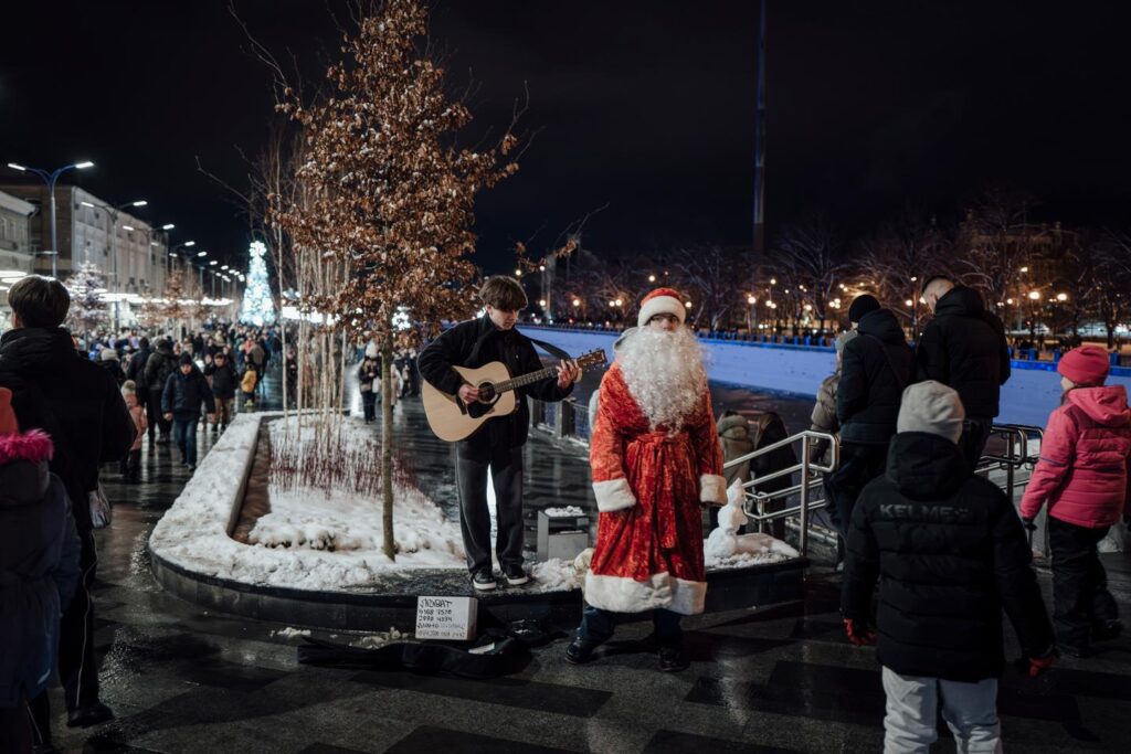 Venir à Kharkiv pendant les fêtes peut se révéler une expérience particulière, surtout si la nuit est tombée et que vous arriviez de Kiev, la capitale ukrainienne, lourdement bombardée depuis le début de l’hiver. Apprêtez-vous à basculer d’un monde en noir et blanc à celui de la couleur. Partout, l’obscurité menace l’Ukraine en guerre, avec d’interminables coupures de chauffage et d’électricité causées par les frappes russes. Mais à Kharkiv, grande ville de l’Est proche de la frontière russe, la célèbre rue Soumska ressemble à une immense guirlande qui illumine le centre-ville. Des décorations se succèdent, géantes, l’une derrière l’autre, débauche de lumières, de couleurs, du rose, du doré, du rouge, tout ! pourvu que ça flamboie. On en serait presque aveuglé, après les avenues sombres de Kiev, où un minuscule sapin clignote parfois à la vitrine d’une épicerie, vaille que vaille, dans le vrombissement d’un générateur plus gros que lui.