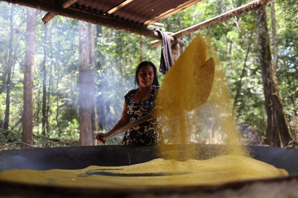 Biscornu, terreux et rugueux, le tubercule s’affiche tout au long de son menu dégustation. Métamorphosé en farine, galettes, bâtonnets frits ou pâte à cappellettis, il escorte viande fumée, soupe de pied de bœuf et poisson d’Amazonie. Et pour clore le déjeuner, un pudim de vó (« flan de mamie ») unit tapioca en flocons et lait de coco échaudé, embaumé de cajá, le fruit du prunier mombin.