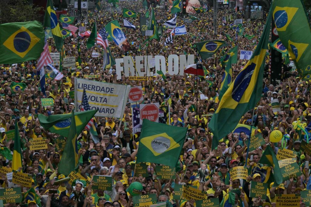 Sur l’avenue Paulista, à Sao Paulo, une immense bannière étoilée des Etats-Unis avait été déployée par la foule, manière d’implorer le secours du président américain, Donald Trump, qui a imposé 50 % de droits de douane aux produits brésiliens pour défendre son protégé. « Une élection sans Bolsonaro est une dictature », proclamait une pancarte, quand d’autres exigeaient « anistia já ! » (« l’amnistie maintenant »).