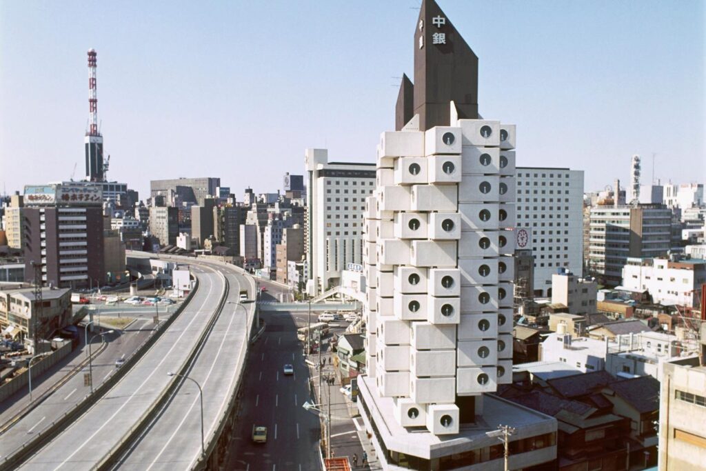 Construite en 1972 en lisière du quartier huppé de Ginza, à Tokyo, démolie en 2022, la tour-capsule Nakagin n’aura pas vécu la vie à laquelle on l’avait destinée. Agrégat de boîtes de béton, chacune percée d’une grande fenêtre ronde, que le théoricien américain Charles Jencks (1939-2019), en son temps, avait comparées à des « machines à laver géantes », ce totem était célèbre dans le monde entier. Il symbolisait le métabolisme japonais, courant technofuturiste qui connut son heure de gloire à l’Exposition universelle d’Osaka, en 1970, et dont les représentants, de Kenzo Tange (1913-2005), le grand maître de l’architecture japonaise de l’après-guerre, à Arata Isozaki (1931-2022), cherchaient à réinterpréter le brutalisme à la lumière de la biologie moléculaire.