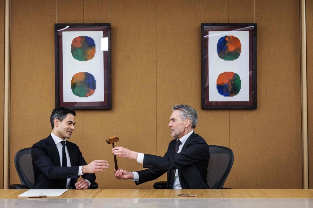 Une intronisation officielle au palais Huis ten Bosch de La Haye en présence du roi Willem Alexander, une cérémonie seulement perturbée par les cris de manifestants du groupe Extinction Rebelion, puis une entrevue avec Dick Schoof, le premier ministre sortant, qui lui a remis les clés de la Salle de la Trêve, où se tiennent les conseils des ministres néerlandais : Rob Jetten, 38 ans, est officiellement devenu le « ministre-président » des Pays-Bas lundi 23 février.