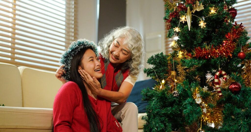 Joyful senior woman and her granddaughter enjoying on Christmas at home.