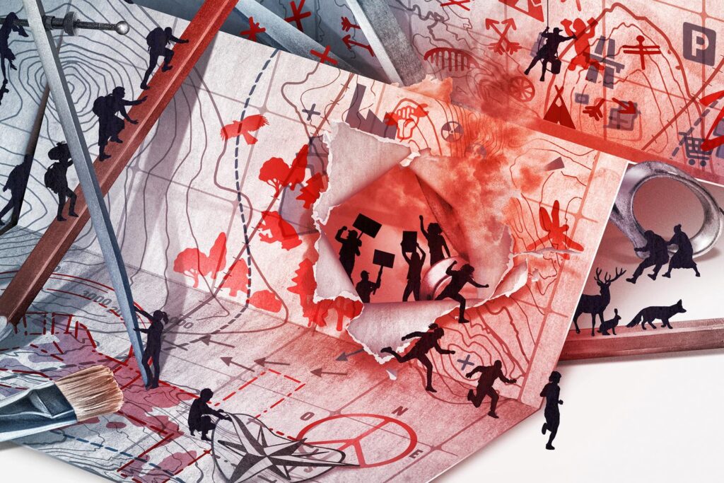Coéditée par IPNS, le journal d’information et de débat du plateau de Millevaches, et la maison d’édition associative A la criée, située à Nantes, la carte au format papier n’est pas destinée aux randonneurs ou aux touristes de passage. En mêlant dessins et récits, elle « vise à questionner les dynamiques forestières », explique Frédéric Barbe, géographe, artiste et membre de l’association, et donne à voir ce que les cartes institutionnelles ne montrent pas : l’industrialisation d’un territoire, la tristesse des riverains face aux coupes rases et leur volonté d’un autre avenir pour la forêt.