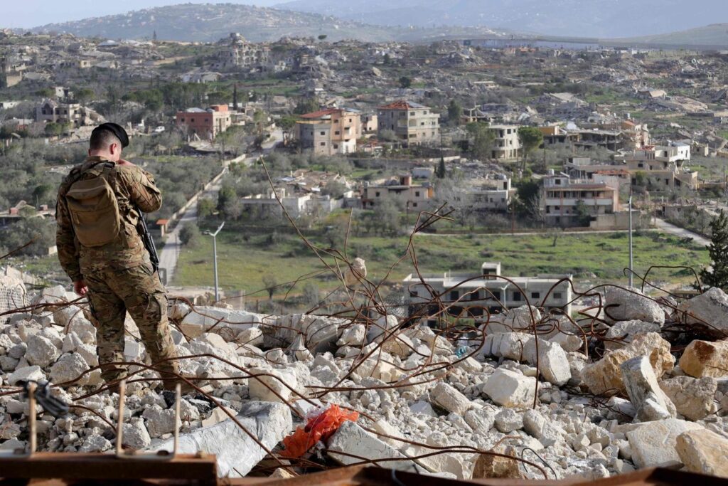 Un soldat libanais dans les ruines du village de Kfar Kila, détruit par l’armée israélienne durant le conflit de 2024, et situé dans la zone frontalière du Liban sud avec Israël, le 8 février 2026.