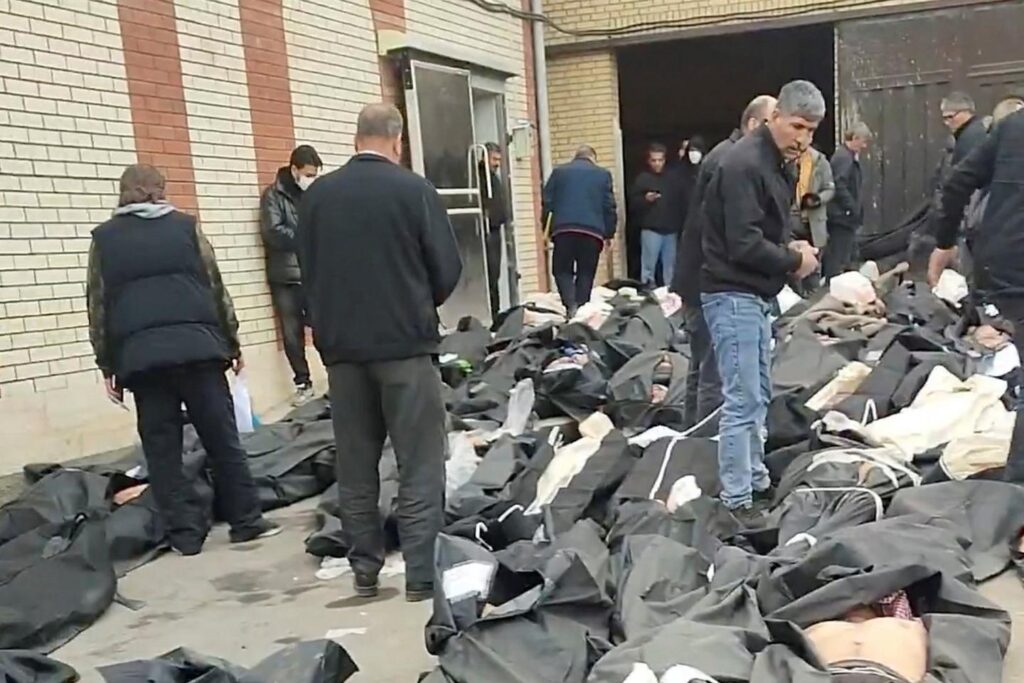 Dans une autre vidéo authentifiée par l’Agence France-Presse (AFP), on voit des dizaines de corps enveloppés dans des sacs noirs devant une morgue de Téhéran, et ce qui semble être des Iraniens à la recherche de leurs proches disparus.