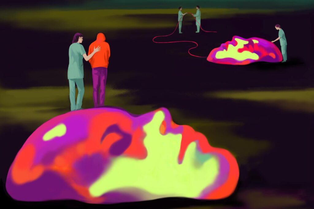« Cela t’arrive-t-il d’avoir des sensations étranges dans ton corps ? », demande la docteure Laroche d’une voix douce, mais pas infantilisante. « Oui, j’ai l’impression d’avoir des insectes qui courent sur ma peau, ou que des trucs me piquent », répond la jeune fille. Elle confie aussi avoir l’impression de ne pas toujours être celle qui pense dans sa tête, comme s’il y avait quelqu’un d’autre. Que lui disent ces pensées ? « De sauter d’un endroit assez haut, glisse Angelina. Mais je ne les écoute pas », ajoute-t-elle.