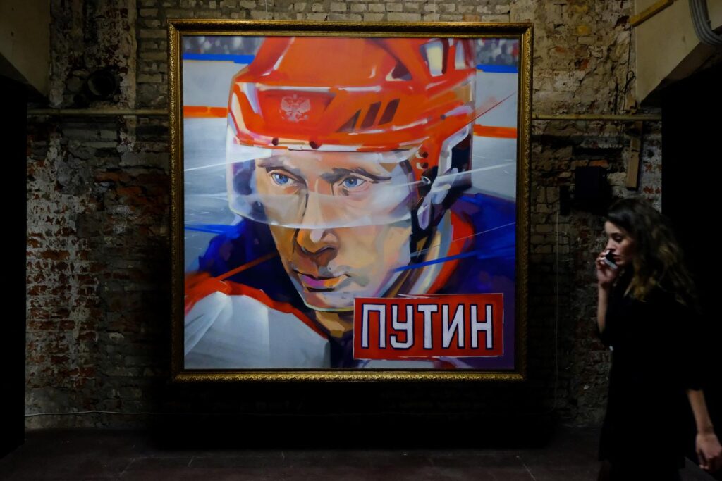 Tableau représentant le président russe, lors de l’exposition « Super Poutine », au Musée d’art ultramoderne, à Moscou, en 2017.