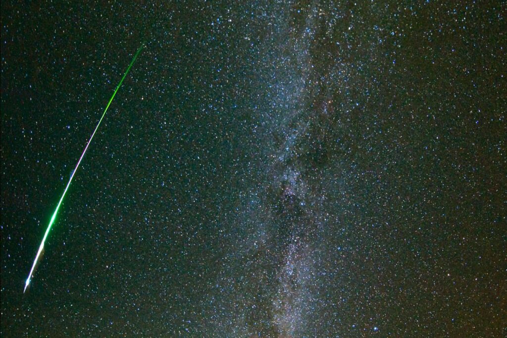 Dans sa course autour du Soleil, la Terre entre en collision avec des poussières interplanétaires et celles-ci donnent naissance à des « étoiles filantes » plus ou moins éclatantes et longues en se désintégrant dans la haute atmosphère. De dimensions microscopiques à centimétriques ces poussières proviennent pour l’essentiel des noyaux cométaires qui viennent virer autour du Soleil. Une fraction de leur croûte glacée est sublimée à l’approche du foyer solaire, ce qui libère de grandes quantités de gaz et de poussières qui gainent irrégulièrement l’orbite de ces astres vagabonds. Si l’on peut voir quelques étoiles filantes chaque nuit, leur nombre augmente considérablement lorsque la Terre frôle ou traverse l’une de ces traînes de poussières cométaires et les astronomes parlent alors d’un essaim. Les belles étoiles filantes qui zèbrent les nuits de la mi-août proviennent de l’essaim des Perséides, mais d’autres essaims spectaculaires sont observables au fil des mois : en novembre, il est ainsi possible de guetter les étoiles filantes de l’essaim des Taurides et celles de l’essaim des Léonides.