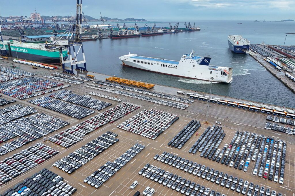 Des voitures destinées à l’exportation dans le port de Yantai, dans la province du Shandong, dans l’est de la Chine, le 29 juin 2025