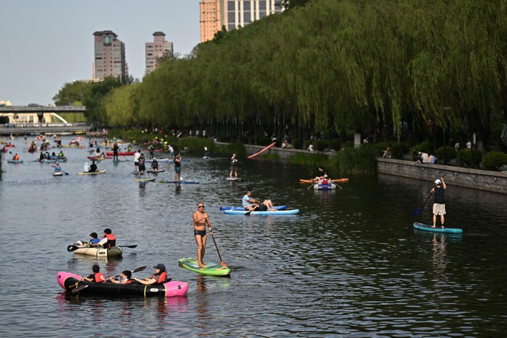 Maillot une pièce rose flashy et bonnet de bain jaune, Mo Lihong grimpe sur la barrière et, sous l’œil admiratif de ses compères de baignade, exécute un parfait salto arrière en plongeant dans le canal. La retraitée fait quelques brasses, profitant du temps agréable de cette fin d’été. D’autres s’essaient aux planches de paddle et aux kayaks de location. Les promeneurs observent toute cette animation avec amusement.