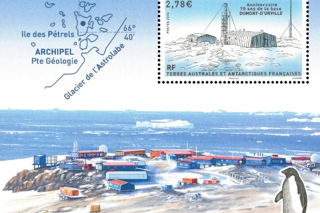 – 2,78 euros (bloc-feuillet), « Anniversaire. 70 ans de la base Dumont-d’Urville », en Terre Adélie. Timbre dessiné et gravé par André Lavergne, imprimé en offset et taille-douce. Dans les années 1950, « les bases présentes sur le district sont la base de Port-Martin (construite en 1950 mais inoccupée depuis l’incendie de janvier 1952) et la base Marret (construite en 1952) sur l’île des Pétrels (archipel Pointe-Géologie), initialement conçue comme un refuge pour l’étude de la population de manchots empereurs présente à proximité. L’objectif dans le cadre de l’Année géophysique internationale [en 1957-1958] est d’édifier deux nouvelles bases en Terre Adélie : une première nommée Dumont-D’Urville sur l’île des Pétrels ; et l’autre nommée Charcot sur le continent, à plus de 300 km de la côte. La base Dumont-D’Urville est mise en service en avril 1956 ». La station Charcot est fermée en 1959.