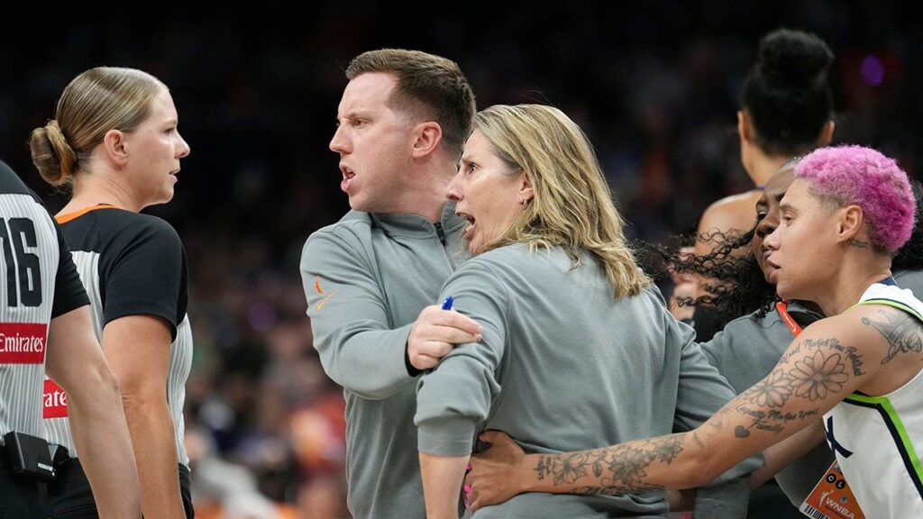 Minnesota Lynx head coach Cheryl Reeve, second from right, yells at officials as she is restrained by Lynx associate head coach Eric Thibault, center, and Lynx guard Natisha Hiedeman, right, after being ejected after earning a second technical foul during the second half of Game 3 of a WNBA basketball playoff semifinals series game against the Phoenix Mercury Friday, Sept. 26, 2025, in Phoenix. (AP Photo/Ross D. Franklin)