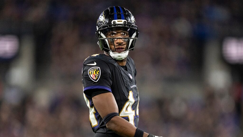 Marlon Humphrey of the Baltimore Ravens warms up before a game against the Kansas City Chiefs at GEHA Field at Arrowhead Stadium Sept. 5, 2024, in Kansas City, Mo. (Kevin Sabitus/Getty Images)