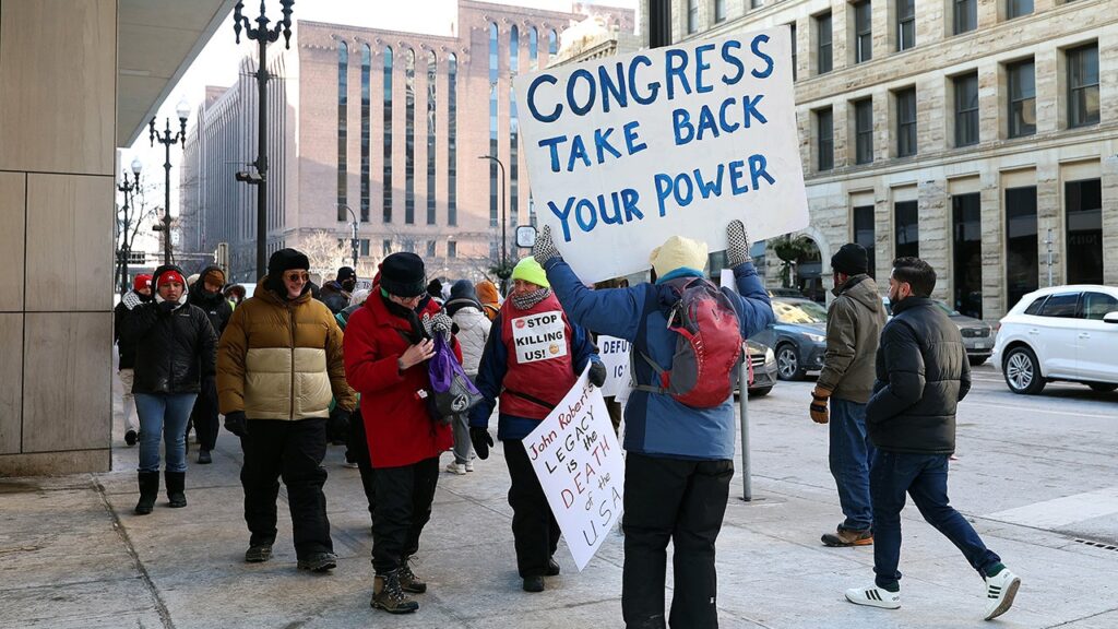 Demonstrators hold signs to protest the presence of federal agents in Minneapolis prior to the start of an NBA game between the Golden State Warriors and Minnesota Timberwolves at Target Center on Jan. 25, 2026 in Minneapolis, Minnesota. (David Berding/Getty Images)