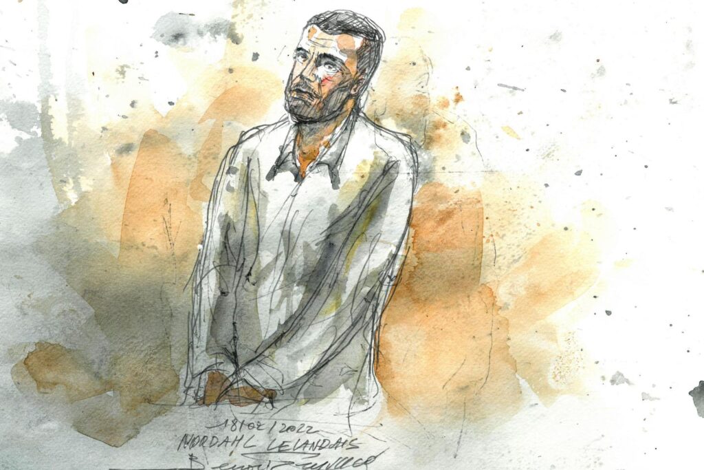 Ce croquis judiciaire, réalisé le 18 février 2022 au tribunal de Grenoble, montre Nordahl Lelandais lors du dernier jour de son procès pour l’enlèvement et le meurtre de Maëlys de Araujo en août 2017.
