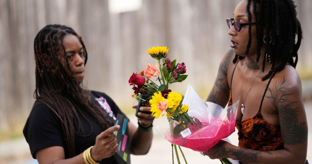Moonlight Phillips, right, and Victoria Williams, members of the Louisiana Coalition for Reproductive Freedom, arrive at Planned Parenthood on the day they are closing, to deliver cards and flowers to the organization, in New Orleans, Sept. 30, 2025.