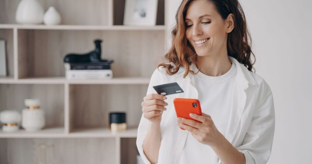 Woman smiling while online banking