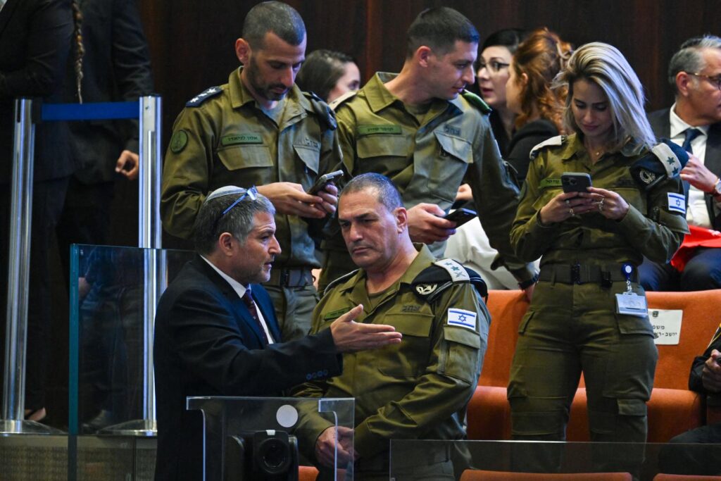 David Zini (en bas à gauche), chef du Shin Bet (service de sécurité intérieure israélien), et Eyal Zamir, chef d’état-major de l’armée israélienne, à la Knesset, le 13 octobre 2025, à Jérusalem.