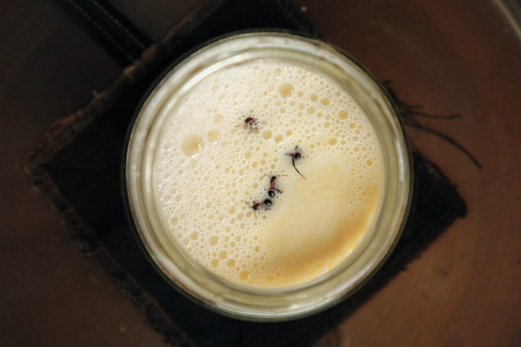 Dans ce procédé, les fourmis jouent le rôle d’inoculum, tandis que la fourmilière fait office d’incubateur naturel. À ce stade, l’acidité, la texture et la saveur du mélange évoquent les tous premiers balbutiements d’un yaourt en devenir : le lait s’était acidifié jusqu’à atteindre un pH de 5, s’était coagulé au fond du récipient et dévoilait « un goût légèrement acidulé, avec des notes herbacées ».