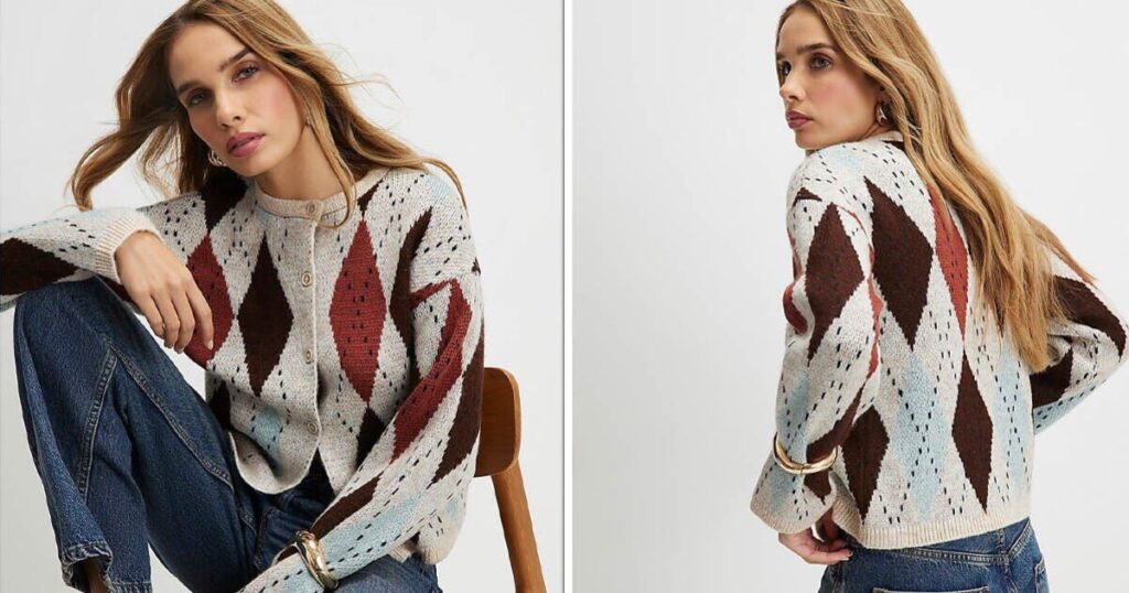 From sparkles to snug winter jumpers, many will be locking in their Christmas Day outfits with under two weeks to go. For those still searching, this brown knitted argyle cardigan from River Island is a rather festive option, and it’s currently available in XS to XL on the clothing brand’s website for £44.