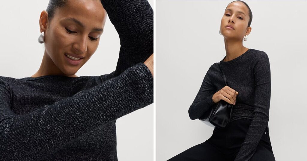 The top works for virtually any occasion, from a casual gathering to a work Christmas party. It has a simple crew neckline and long sleeves, and its cotton-rich material is woven with metallic fibres that make it sparkle throughout.