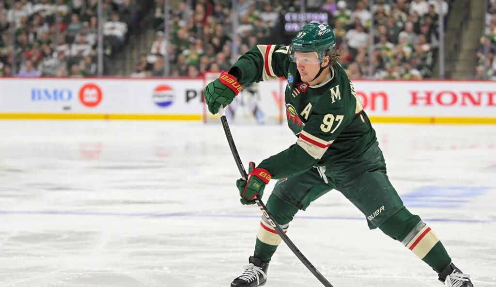 Minnesota Wild forward Kirill Kaprizov (97) takes a shot on goal against the Vegas Golden Knights during the second period in Game 6 of the first round of the 2025 Stanley Cup playoffs at Xcel Energy Center. (Nick Wosika/Imagn Images)