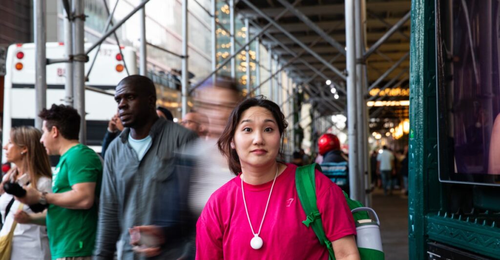 Friend looks like a glowing, chunky AirTag that hangs from your neck on a shoelace. It doesn’t go with most outfits, and its always-on glow draws attention to your chest in weird ways. (The glow shines through even if you stick it under a blouse.)